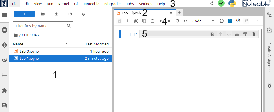 There are a few sections of the Noteable interface that will be useful to know your way around: