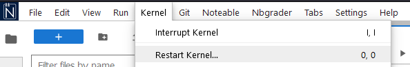 If that doesn’t work, then you can restart the Kernel (think of this as a reboot of the system) by clicking the Kernel tab of the Notebook menu followed by the Restart Kernel option.