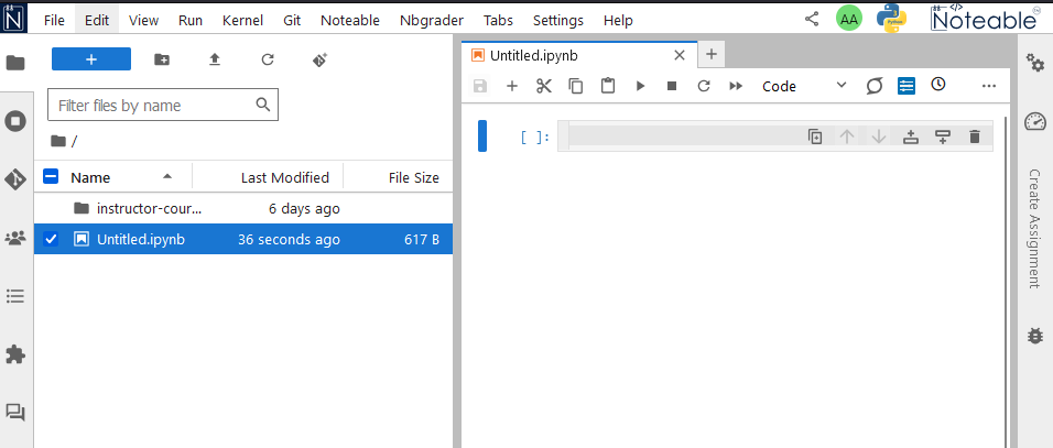 On the left is the Jupyter File Browser, which shows all of your files and folders/directories saved in Noteable. On the right is the Launcher, which contains buttons for quickly creating notebooks and shells.