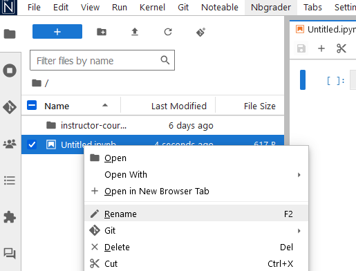 We will look at using Jupyter Notebooks in more detail later. For now, notice at the top you have the text “Untitled”. This is a placeholder filename that has been assigned to this new Notebook you have just created. To rename your notebook, right-click on Untitled.ipynb in the File Browser and click rename.